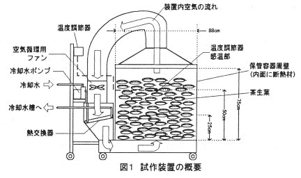 - 開発した生葉保管装置は、水冷の熱交換機から保管容器下部を通過した冷風が、保管容器内の茶葉を冷却し、ダクトから送風機を経て、再び熱交換機に送られる装置であり、設定機内温度に連動させ運転する(図1)。