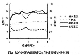 - 試作装置内湿度は、顕熱変化中の冷却と仮定した場合の推定湿度と同様に推移し、生葉投入時の外気湿度より高く保たれる。温度も外気温の影響を受けず設定温度付近に維持され、良好な保管環境が実現される(図2)。
