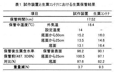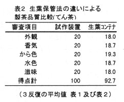 - 本装置で保管した生葉から製造したてん茶の製茶品質は、生葉コンテナで保管したものと比べ明らかに優れ、品質全般に新鮮みを有する(表2)。