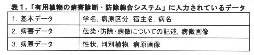 - 農作物の病害についての情報を得たい場合に、インターネットに接続されたパソコン等があれば、誰でも、いつでも、どこからでも、必要な情報を入手できる。入手できるデータの種類を表1に示す。平成9年1月現在で、イネ,ムギ,野菜等23品目のデータが利用できる。