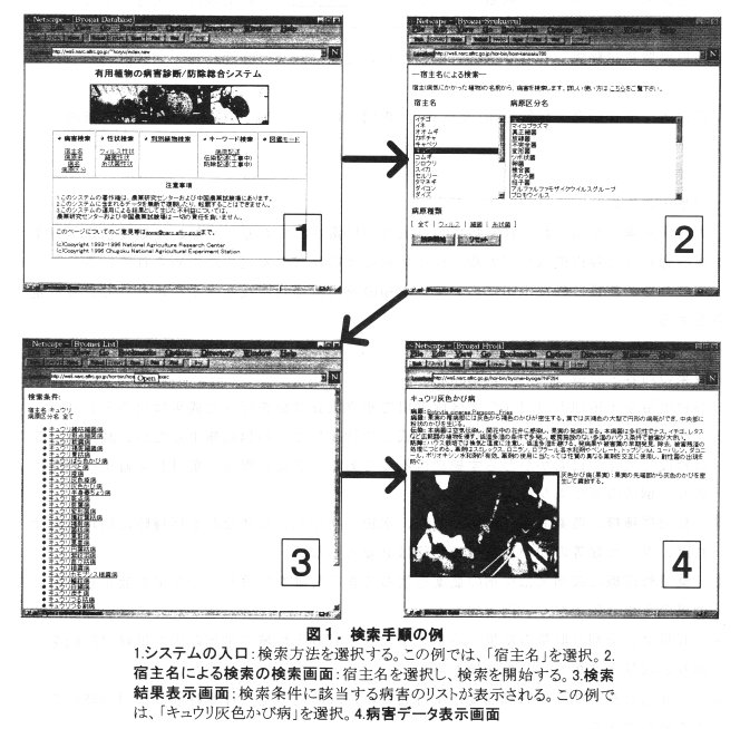 - WWW版の「有用植物の病害診断・防除総合システム」では、検索方法として、(1).宿主名,病原名,病名,病原区分による検索、(2).病原の性状による検索、(3).判別植物によるウィルスの検索、(4).キーワードによる検索、を提供している。検索手順の例を図1に示す。また、一般向けに画像を含むデータのみを集めた図鑑モードも用意している。
