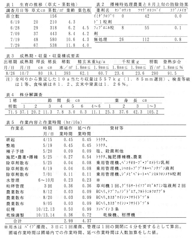 - 緩効性被覆尿素肥料を播種時に窒素成分で10a当たり約14kg施用したが、減水深が5cm程度と大きいにもかかわらず穂肥は不要である。また、稈長、葉身長も適正な範囲にあり、倒伏の発生もない。
