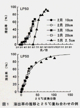 - ほ場埋設法により被覆尿素の溶出率を測定し、溶出パラメータを反応速度論によって求める。このパラメータと茶園の日平均地温を用いて、任意の時期に施用する被覆尿素の溶出を予測することができる。