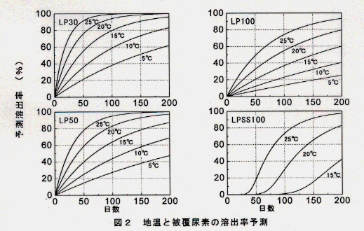 - 予測では25℃恒温下における80%溶出到達日数は、いずれもメーカー資料(水中)より1~2割長い。LPSS100の溶出開始時期は15℃以下で大きく遅延する(図2)。