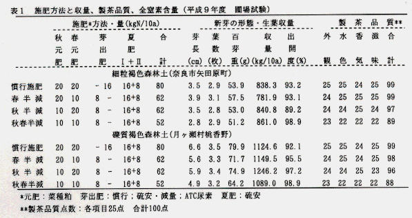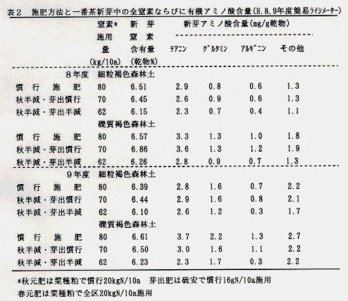 - 秋期元肥を半減しても細粒褐色森林土では一番茶の新芽窒素含有量、アミノ酸含量は維持できる。(表2)