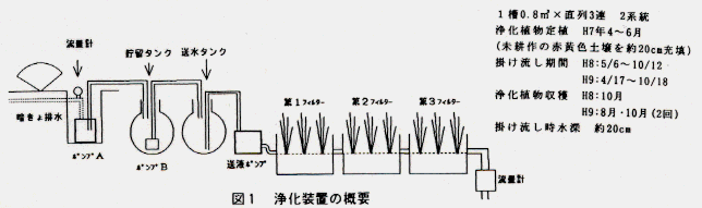 - 前年度報告した浄化装置に、所内茶園(5.0a)から採取した暗きょ排水を3L/h程度の流量で掛け流し、硝酸態窒素浄化能力を検討した。掛け流し期間は水生植物生育期間とした(図1)。