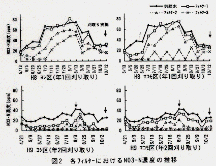 - ヨシ・マコモの刈り取りが10月期だけの場合(年1回刈り取り)、期間内に流入した硝酸態窒素量の80%以上を浄化することができる(表2)。しかし、7月以降は浄化能力の低下により各フィルターにおける硝酸態窒素濃度低減量が徐々に減少する(図2)。