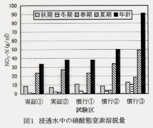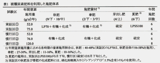 - 自然仕立て茶樹の窒素吸収特性を考慮し、秋肥に被覆尿素肥料70日タイプ(以下LP70という)を主体とした混合肥料を、また、一番茶摘採後の番刈り直前に、夏肥としてLPSS(シグモイド溶出型)100日タイプを施用することで年間窒素施用量の約40%を被覆尿素肥料で置き換える施肥体系を組み(表1)、浸透水中の窒素溶脱量を調査した。