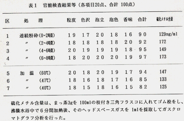 - 官能検査によるまっ茶の品質は、連続粉砕では、温度が高いほど品質が向上する。加温処理でも温度が高いほど品質は向上するが、連続粉砕に比較して、やや色沢が劣り、滋味で感じる香りが少なく、やや淡泊となる。粉砕中の温度推移から考えると、連続粉砕より加温処理の品質が劣る(表1)。