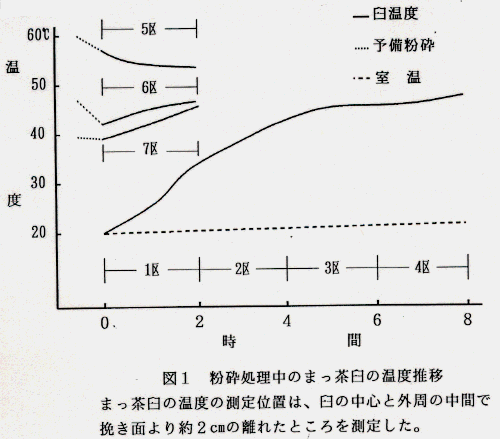 また、まっ茶臼の温度を60℃、47℃、40℃に赤外線ランプで加温すると、予備粉砕時に設定した温度より、まっ茶臼の温度がやや下がり、60℃の加温処理では、さらに2時間の粉砕で約 3℃下がる。室温20℃では50℃前後がまっ茶臼の粉砕中の摩擦で起こる温度の上限と考えられる(図1)。