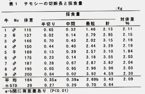 - チモシー乾草の切断長を梱包の半切り(平均12.4cm)、中間(4.1cm)、最短(1.7cm)の3通りに調整し、自由採食させると、1日の採食量の平均は最短が最も多かった。また、飼槽から牛床への引き込み量は最短で最も少ない(表1)。