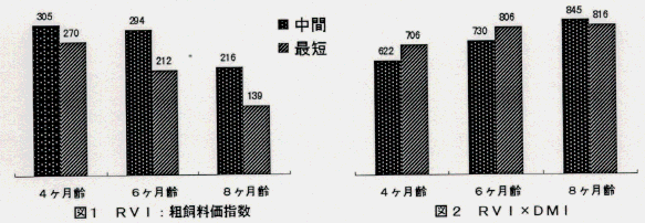 - Sudweeksらの示した粗飼料価指数(RVI)を用いて、飼料価を粗飼料の物理性と栄養性の積(RVI×DMI)として算出すると、4、6カ月齢では最短、8カ月齢では中間の方が大きくなることから、4、6カ月齢では約 1.5cm、8カ月齢になると約4cmの切断長が、粗飼料価と採食性の両方をより満たしていると考えられる(図1、図2)。