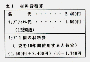 - ラッピング方法:袋詰めトウモロコシの形態を保つことと、高い気密性を確保するためラッピングは通常の2倍の12層6回巻とする(材料費積算・表1)。
