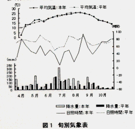 - 気象:平均気温は平年と差はなく、日照時間は平年に比べ5月から9月までの間8月の下旬を除き短く、降水量は7月下旬から8月中旬までは平年より若干多く、9月中旬以降は少ない。(図1)