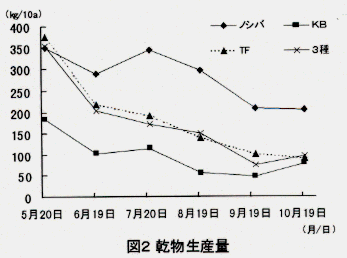 - 乾物生産量は、ノシバ以外の草種では5月以降9月まで低下し、10月で僅かに上昇する傾向にあったが、ノシバは5月から8月まで高い生産量を維持し、生産量の低下した9月、10月においても他草種に比べて高い水準にあり、5月から10月までの間は寒地型草種を補完している。(図2)