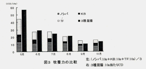 - 短草型草種(ノシバ、スノーTF、スノーKBⅡ)を組み合わせた草地と3種混播草地ともに5月の牧養力がもっとも高く、9月に向け減少し、9月牧養力/5月牧養力の割合は3種混播草地で19%になったのに対し、短草型草地の組み合わせでは34%と3種混播に比べ安定する。(図3)