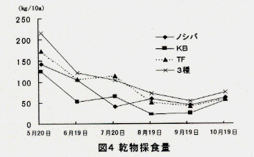 - 寒地型短草種はノシバに比べて嗜好性が良く、生産量に対する利用量の割合が高いが、各月の乾物利用量は7月を除き差がない。(図4)