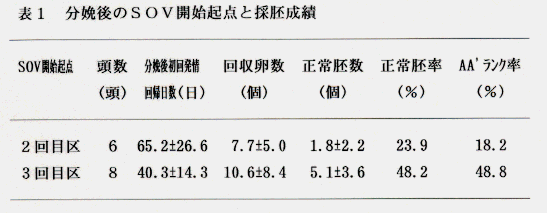 - 分娩後2回目の発情(6頭)と3回目の発情(8頭)を起点として、SOVを開始する2区分について採胚成績等を検討したところ、3回目区は回収胚数、正常胚数が多く、正常胚率も高い傾向を示した(表1)。