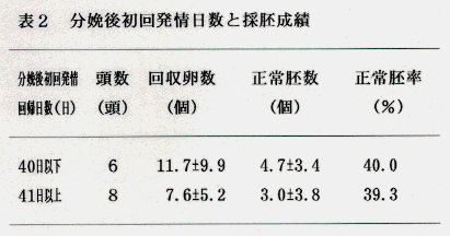 なお、3回目区と2回目区の分娩後初回発情回帰日数の差が大きいことから、初回発情回帰日数を40日以下と41日以上に区分して採胚成績を比較したが、回収胚数、正常胚数とも差はなかった(表2)。