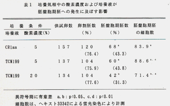 - 胚盤胞期胚の細胞数は、5%酸素濃度の気相条件でTCM199(卵丘細胞との共培養)およびCR1aa液を用いた場合が、20%酸素濃度の気相条件でTCM199(卵丘細胞との共培養)を用いた場合に比べて多い(表1)。