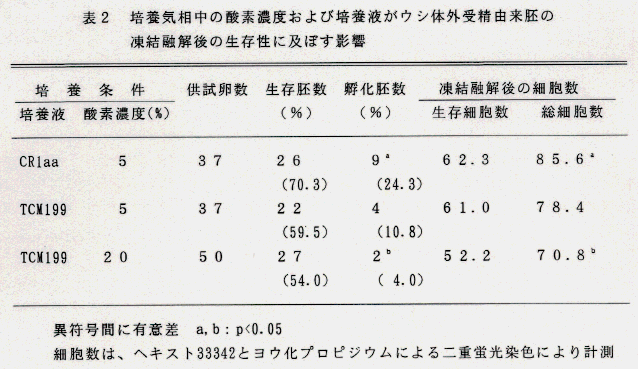 - 胚盤胞期胚をリノール酸アルブミン4.0㎎/ml添加の1.5Mエチレングリコールを凍結媒液として用いて凍結した結果、凍結融解後の孵化率は、5%酸素濃度の気相条件でCR1aa液を用いた場合が、20%酸素濃度の気相条件でTCM199(卵丘細胞との共培養)を用いた場合に比べて高い(表2)。