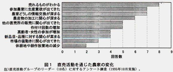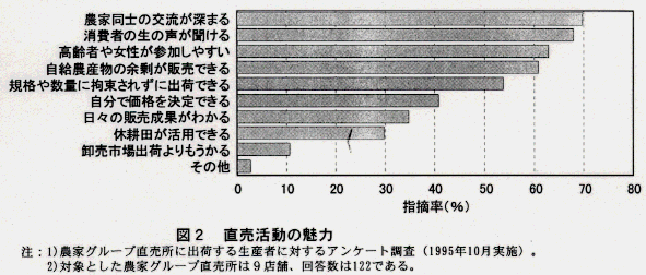 - 生産者グループのリーダーからの回答によると、直売活動を通じて参加農家の生産・販売意欲は向上していることがみとめられる(図1)。農家グループ直売所に生産者が参加する主な魅力は、「農家同士の交流が深まる」、「消費者の生の声が聞ける」、「高齢者や女性が参加しやすい」、「自給農産物の余剰が販売できる」、「規格や数量に拘束されずに出荷できる」等にある(図2)。
