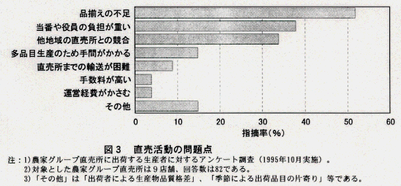 - これらの魅力に比べると指摘割合は低いが、問題点として「品揃えの不足」、「当番や役員の負担が大きい」、「他地域の直売所との競合」等があげられる(図3)。