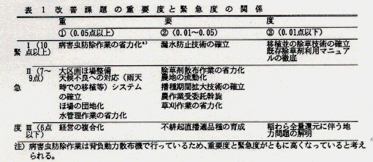 - 上記の改善課題の重要度と緊急度とを組み合わせると、両者とも高い改善課題は病害虫防除作業の省力化であった。緊急度が高いものの重要度が低い改善課題は、漏水防止技術の確立等であった。重要度が高いものの緊急度が低い改善課題は、大区画ほ場整備、天候不良時の対応システムの確立、ほ場の団地化等であった(表1)。