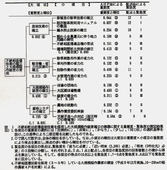 - 重要度の高い改善課題は、大区画ほ場整備、経営の複合化、天候不良への対応システムの確立、病害虫防除作業の省力化等、経営の安定性の向上や軽労働・省力化技術の確立等であった。一方、緊急度の高い改善課題は、移植並の除草技術の確立、既存除草剤マニュアルの徹底、漏水防止技術の確立等の不耕起乾田直播栽培技術に関するものと病害虫防除作業の省力化等であった(図1)。