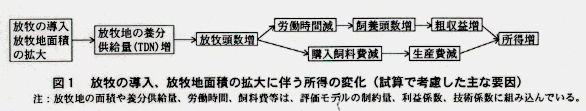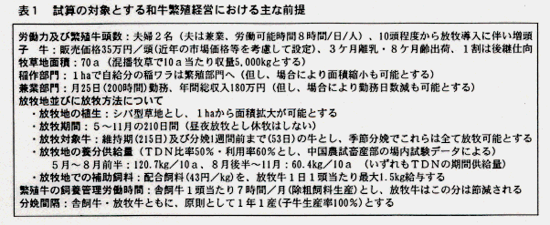 - 低投入で持続的なシバ型草地を活用した放牧は、和牛繁殖経営において低コスト・省力化等が期待されており、これらの効果と、放牧地の条件や飼養技術等の変化が及ぼす影響についての定量的な把握が求められている。そこで、和牛繁殖経営のなかで典型的な耕畜複合経営を対象に、放牧導入の経済性について経営全体の枠組みでの試算・評価を行う。