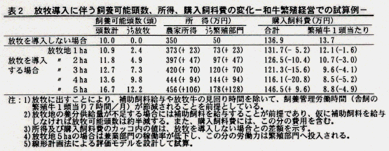 - 放牧を導入しない場合は、飼養可能頭数10頭、農家所得350万円(うち繁殖部門50万円)となる。これに対し、放牧を導入し更に面積拡大を図った場合は、例えば放牧地3haのとき、労働時間の節減により飼養可能頭数は13頭程度に増加するとともに、農家所得は70万円増加し、420万円(うち繁殖部門120万円)となる。同時に、繁殖牛1頭当たり購入飼料費は9.6万円となり、放牧を導入しない場合に比べ約4万円の節減が期待される(表2)。