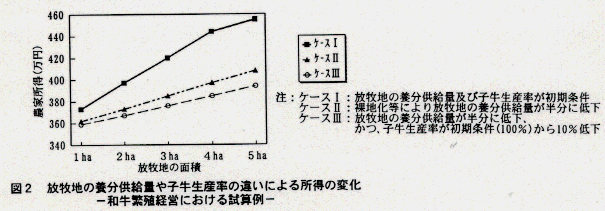 - ただし上述の効果は、放牧地の養分供給量(TDN)や飼養管理技術に大きく左右される。仮に、過放牧等による裸地化に伴い放牧地の養分供給量が初期条件の半分程度に低下した場合、また加えて、子牛生産率が100%(1年1産)から10%低下(1ケ月強の遅れに相当)した場合、放牧地5haのときには、各々48万円、62万円の所得の低下につながる(図2)。