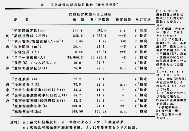 - 民宿全体で、経営状態の順調な民宿経営をみると、有意に投資額・収容定員が少ないにも関わらず、客室面積当たりの利用客数が多く、規模に比べて効率的な民宿経営を行っている(表1)。また、これらの順調経営では民宿の長所を、くつろげること、と考えている経営者が相対的に多く、接客対応上の配慮を行っていることが伺える。しかし、近隣のスキー場規模が大きく、スキー客に依存した経営体質であることも事実である。