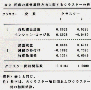 - 農家民宿の今後の経営展開の方向性について、5項目を、変数分類から二つの方向性に区分した。一つは、自炊施設設置とペンションロッジ化で、個別対応による宿泊施設を中心にハード面の整備拡大を指向するもの。もう一つは、菜園設置、民宿の格付け、および特産物開発で、地域的対応によるソフト面の改善や宿泊施設以外の活動の複合化など経営内容の高度化を指向するものである(表2)。