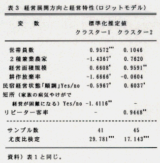 - この二つの方向性に作用する経営特性は、前者では家族労働力にも恵まれ耕作放棄率は低いが、経営状態が順調でないため、施設投資を行い整備拡大により収益向上を指向している。後者では、経営面積が大きく、民宿のリピーター客率が高く、経営状態が順調で現状に満足しているため、現状の民宿規模を維持しその内容の改善高度化を指向している。今後は、この経営指向性の違いに対応した政策支援が必要である(表3)。