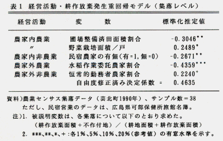 - 農業センサス集落データを用いた耕作放棄と経営活動との関係を計測した結果、圃場整備事業、農家民宿経営の有無、および集落営農による水稲作業受委託活動とが耕作放棄の防止(農地保全)に統計的に有意に貢献していることを明らかにした(表1)。標準化推定値から農地保全効果への貢献度を求めると、約4割が集落営農による効果、約3割が圃場整備効果、約3割が民宿農家の存在効果である。つまり、農地保全機能は、集落営農活動による維持効果、圃場整備効果、民宿農家の存在効果の結合効果といえる。
