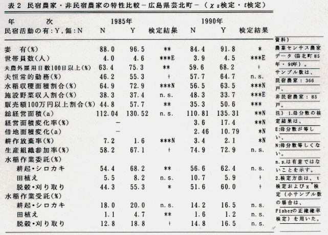 - そこで、民宿農家が存在することによる効果の発生メカニズムを、個票データから民宿経営の有無による農家の経営特性を比較分析した(表2)。その結果、民宿農家は安定農外就業を中心にしながら、省力化の進んだ水稲作へ傾斜し、労働節約的な対応をして、土地集積を一定程度行ってきたことが判明した。しかし、生産組織との関連では、受託も行うが委託もより行っている。このことから、民宿農家の土地集積と集落営農活動が機能分担を行いながら、相互に補完し合って農地保全機能を果たしていることがわかる。