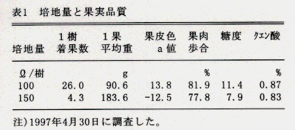 - 果実横径が35mmに達した時点でかん水開始点をpF2.4(葉の水ポテンシャルψmax =-1.0MPa相当)に、また1回あたりのかん水量を5mmにそれぞれ制限することによって、4年生で糖度11以上のS級果を収穫できる(表1)。