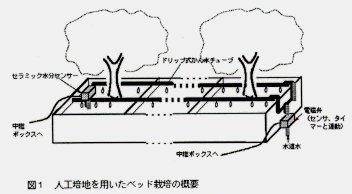 - 木枠ベッド(長さ6m、深さ30cm。樹間0.8m、ベッド幅0.6m。)に植栽した「上野早生」を供試し、セラミック水分センサー、電磁弁等でかん水を自動化する(図1)。パーライトおよびピートモスを9:1に混合した素材を培地とし、1樹あたりの培地量を100リットルとする。断熱材等でベッドを被覆し、あらかじめ冷却パイプを埋設しておく。