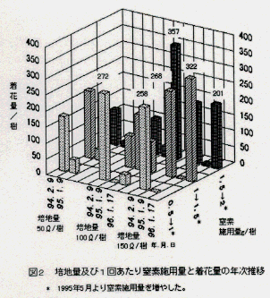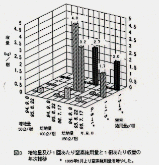 - 配合肥料(N:P:Kが5:4:3)を水に溶かし、冷却期間と水切り期間を除いて月に1回施用する。3年生(未結果)までは1回あたり窒素施用量を1.0g/樹、4年生で1.5gとすることで栄養成長、結実ともに優れる(図2、3)。