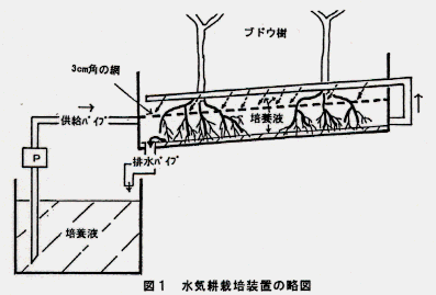 - 水気耕栽培は、ブドウの根部をプラスチック網で支えて浮かし、その上からシャワー方式によって培養液を施用する循環式水気耕栽培装置によって行う(図1)。