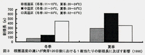 - 冬季(12月上旬~5月上旬)、夏季(5月中旬~10月上旬)ともに、根圏温度が30~33℃で新梢及び新根の生育が最も優れる(図3)。