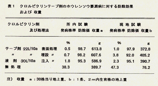 - クロルピクリンテ-プ剤の防除効果は、地表面に置く表面処理、深さ15cmの地中に埋め込む埋設処理いずれの方法も、同液剤の注入処理と比較してほぼ同等の高い 防除効果を示し、収量においても同程度であり無処理に比べ極めて高い(表1)。