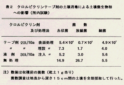 - 土壌微生物相に対する影響は、糸状菌、放線菌で強く現れ細菌では小さい。薬剤間ではテ-プ剤の表面、埋設両処理間で大きな差はなく、また液剤との間においてもほぼ同程度で、これらは同様の菌数を示す(表2)。