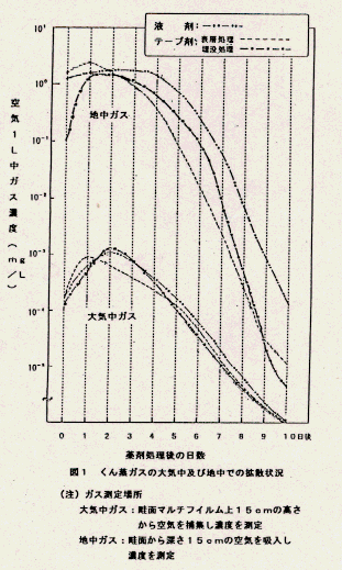 - 消毒中(被覆期間)のくん蒸ガスの拡散は、表面処理の方が埋設処理よりも早めに 最高濃度に達し、その後の減少もやや早い。一方、液剤はテ-プ剤に比べてガスの減少速度がやや遅く、この傾向は大気中よりも地中への拡散において明瞭である(図1)。