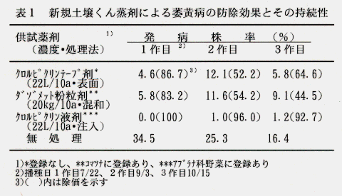 - 新規土壌くん蒸剤(クロルピクピンテープ剤)は萎黄病に対して防除効果は高く、消毒作業時の安全性も向上したが、連作により短期間のうちに被害が漸増する(表1)。