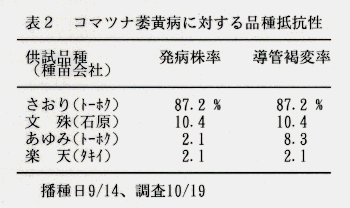 - 市販品種において、コマツナ萎黄病に対する抵抗性は顕著な差が認められ、市場性(無袴型で葉色濃く、耐暑性が強い)も勘案して、有望品種としてあゆみ、楽天が推奨される(表2)。