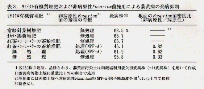 - リサイクル有機質堆肥(紅茶・コーヒー・ウーロン茶粕堆肥)に、コマツナ栽培ほ場より分離した非病原性Fusarium 菌(F.oxysporum NPF-A )を付与して土壌に施用することにより、萎黄病の発生が軽減される(表3)。
