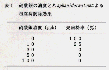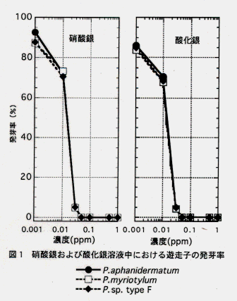 - 硝酸銀、硫酸銀、酸化銀の溶液は、Pythium aphanidermatum 、P.mriotylum 、P.sp. typeFの遊走子に対して30ppbで遊走子の運動を阻害し、50ppbで発芽を完全に阻害する(図1)。