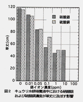 - キュウリに対する障害は、硝酸銀濃度50ppb以上でやや生育抑制が認められ、100ppb以上で生育抑制が顕著となり、100ppmでは、植物体が枯死する(図2)。
